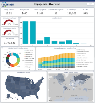 Acumen’s engagement dashboard provides associations with meaningful engagement scores based on how they interact with you across all your important touch points. This includes membership, community interactions, event attendance, email data, product purchases and more. With this holistic view, you can start to understand the characteristics of the most and least engaged members and which activities lead to higher engagement. You can also compare engagement behaviors and monitor trends by segment, start to build segmented lists, view engagement scores over time and uncover trending activities.