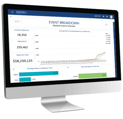 By pulling in data from all your event and registration systems into one place, Acumen event data analytics for associations provides current and historical data on your event registrations and sales. Use historical behavior, transactions, engagement data and predictive models to make informed and confident decisions about your marketing and engagement efforts to boost attendance.