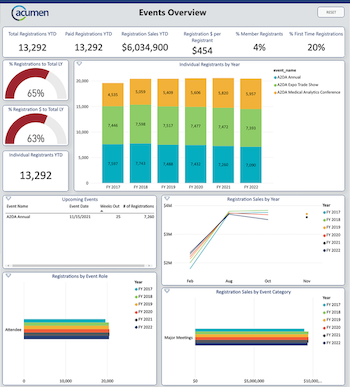 Acumen Events helps event teams make data-informed decisions to improve event performance with comprehensive data, KPIs and built-in analyses. With a complete, consolidated view of registrations, attendee demographics, behaviors and more, you can start to optimize your event revenue and attendee experience.