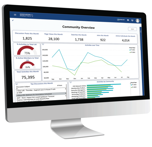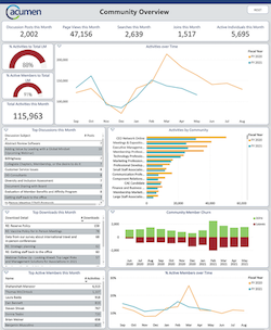 Tie success in your community to the KPIs your executives and board expect in one centralized dashboard. Having all your community data in one place alongside your other systems’ data allows you to see trends between member activities, such as the way community interactions correlate to renewal rates or event attendance. As the top analytics platform for your community data, Acumen also gives you quick, easy access to these insights without manual, time-consuming work for analysts.